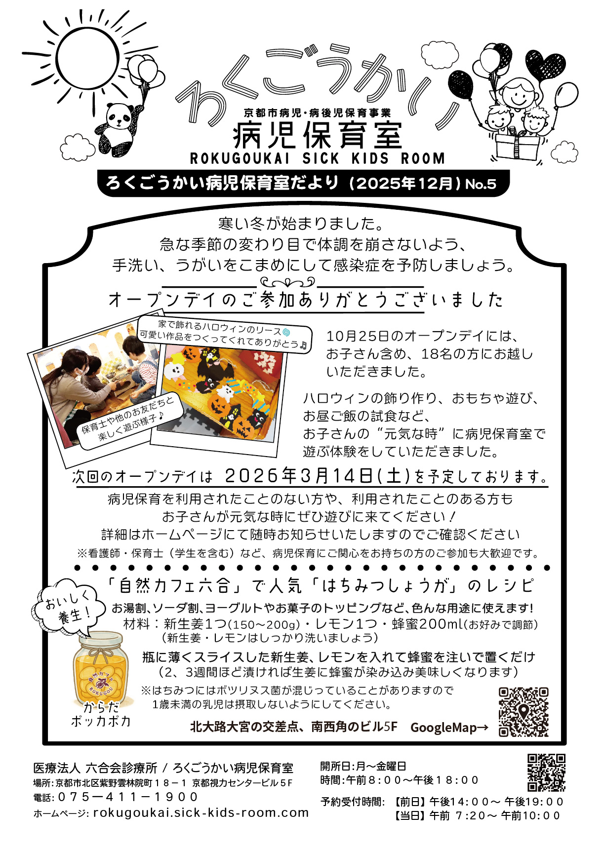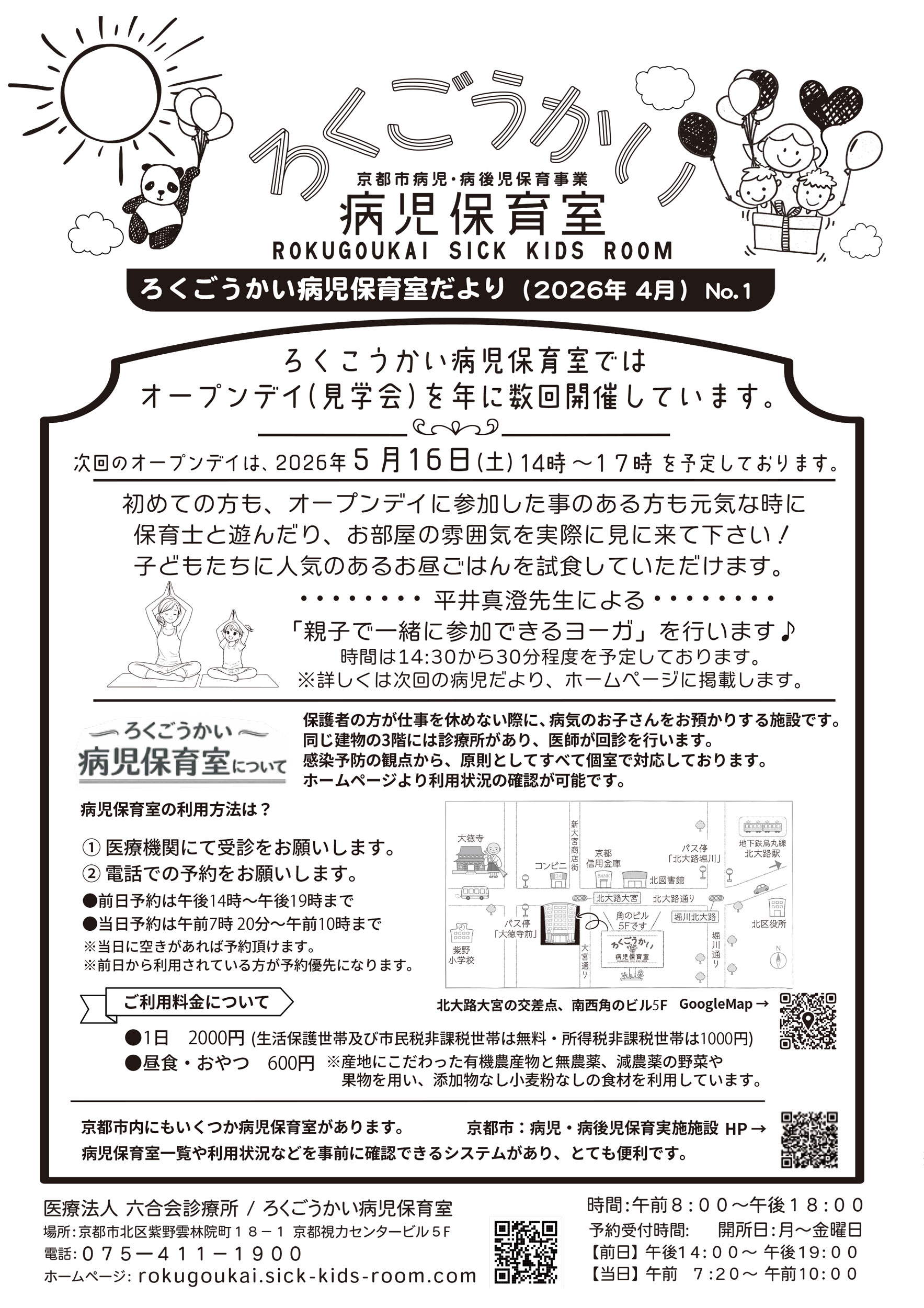 ●医療法人 六合会診療所『ろくごうかい病児保育室』は、京都市より委託を受け開設した病児・病後児保育施設です。少人数制による原則個室。「医療ビル」内にあるため、医療ビルならではの連携ができること、多くの医療従事者がいることも安心のひとつです。